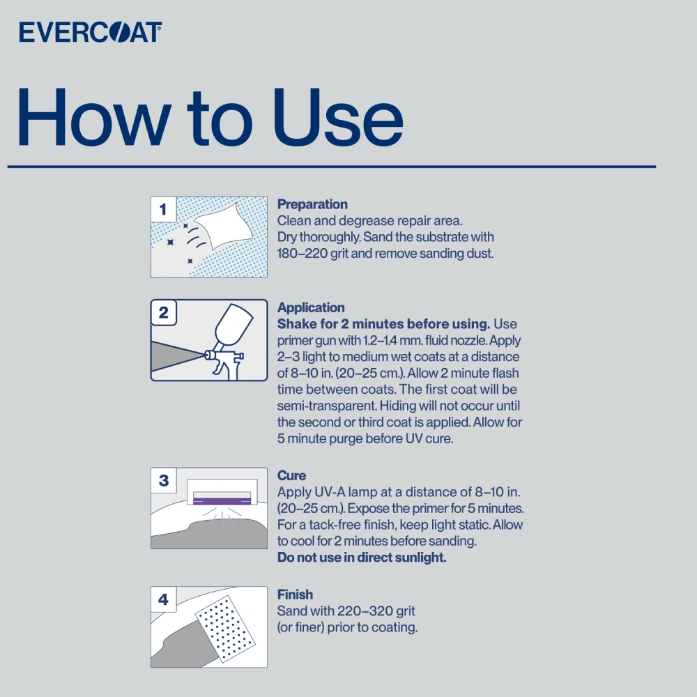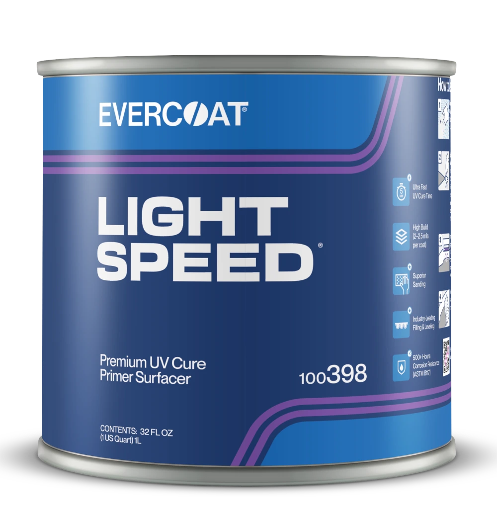 Light Speed® UV Cure Primer Surfacer is a 1K, ready-to-spray polyester primer surfacer. It delivers high build & cures ultra fast in just 5 minutes, with industry-leading filling & leveling. Pair with Light Speed® Optex Premium Lightweight Filler for Evercoat’s most premium duo.